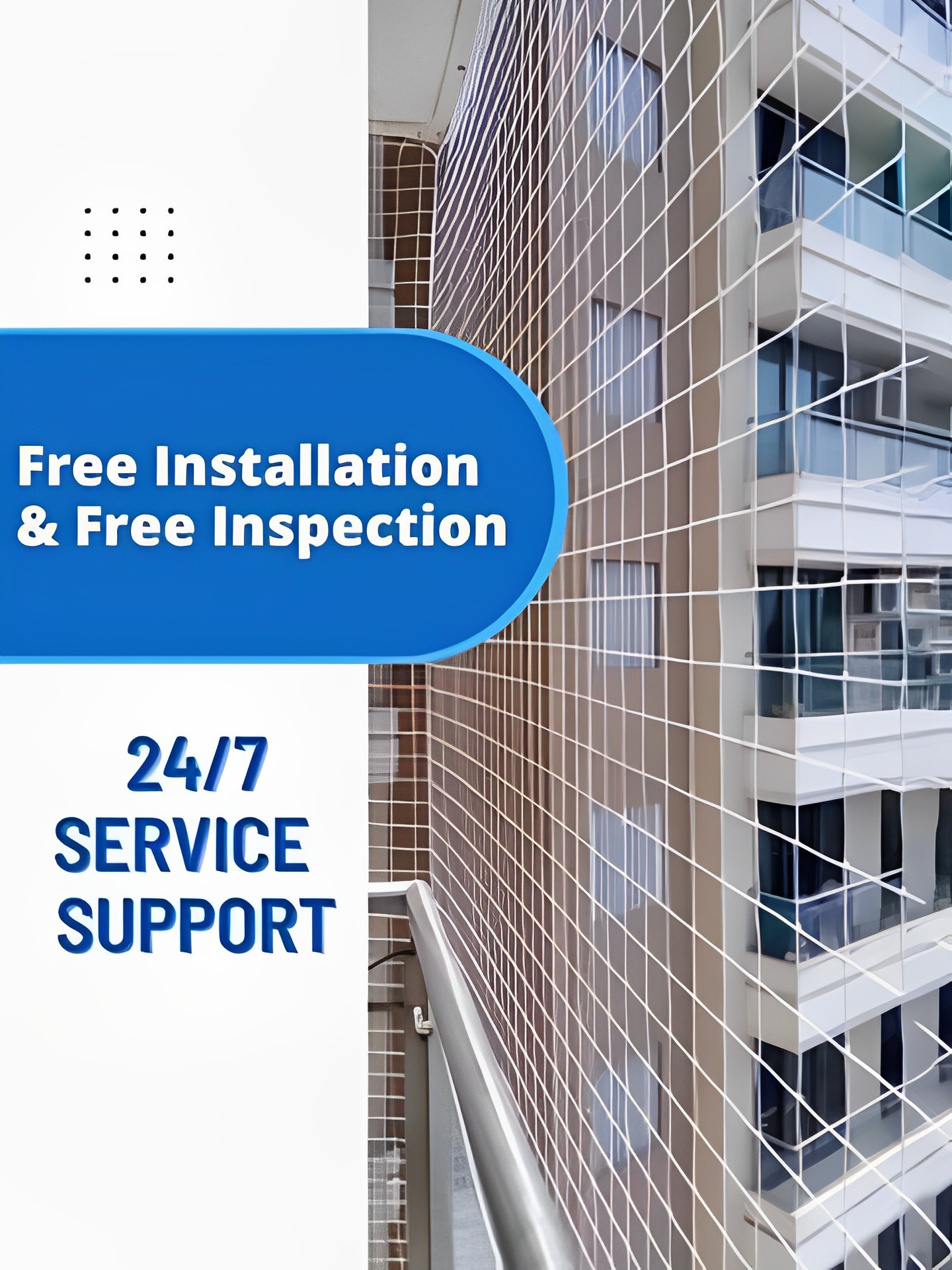 We provide completely free installation and inspection services for any type of net fixing. Our special accident prevention system with safety nets can protect adults, children, and pets from harm.